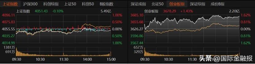 沪指微跌0.1%报4051.43点,创业板指收涨1.43%报3678.29点,深证成指收涨0.6%。北证50大涨4.77%,科创50微涨0.08%,沪深300微跌0.17%,上证50跌近1%。