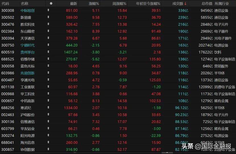指数表现不错,但个股跌多涨少,共计2396只个股收涨,涨停股76只;2986只个股收跌,跌停股7只。14只个股日成交额超过100亿元,CPO概念龙头股“易中天”(中际旭创、新易盛、天孚通信)继续大涨:中际旭创收涨5.11%报851元/股,新易盛收涨9.58%报589元/股,天孚通信收涨6.67%报379.28元/股。但宁德时代回调2.15%报444.2元/股,佰维存储收跌5.62%。