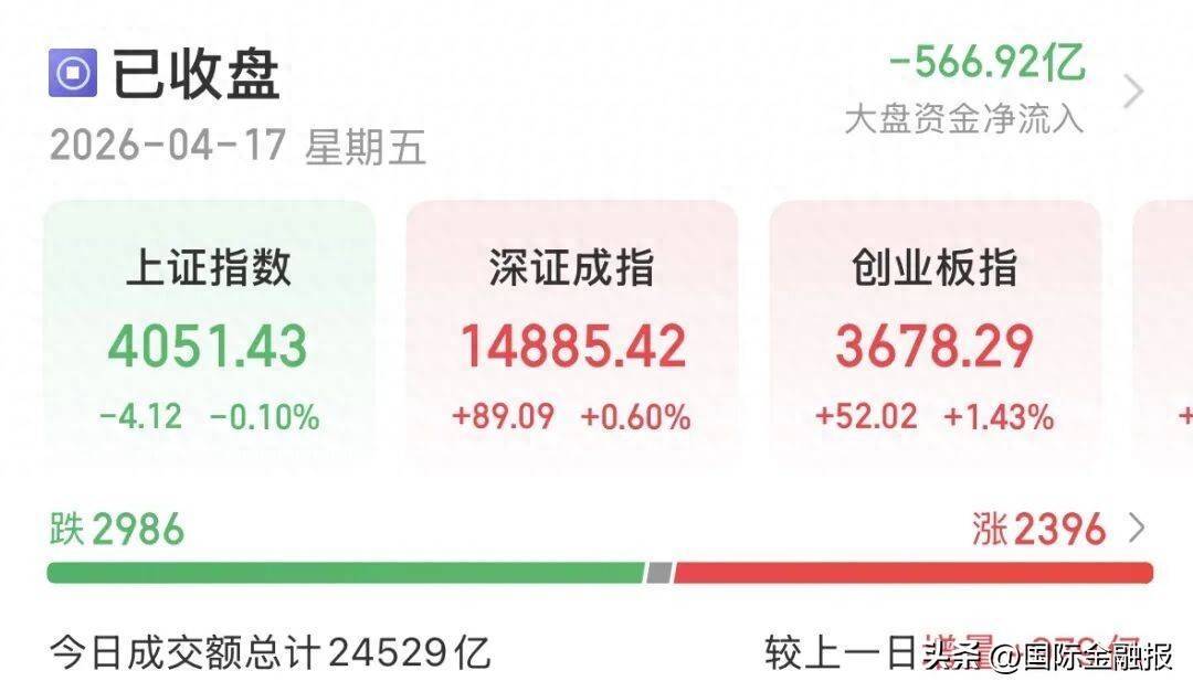 4月17日,A股低开高走,创业板指再创近11年新高。个股涨跌互现,2396只个股收涨;板块分化明显,食品饮料领跌,但得益于AI算力需求爆发,通信板块大涨。