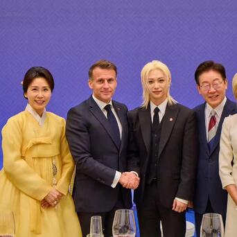 在韩国娱乐圈爱豆地位真超过演员了!马克龙夫妇和李在明夫妇合影中,26岁男爱豆稳居C位。
